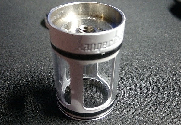 Корпус выполнен из нержавеющей стали, а стекло из pyrex материала. Объем бака составляет 4 мл, что довольно много при таких небольших размерах. Высота 45 мм, диаметр 22 мм. Вес танка составляет 60 грамм.
