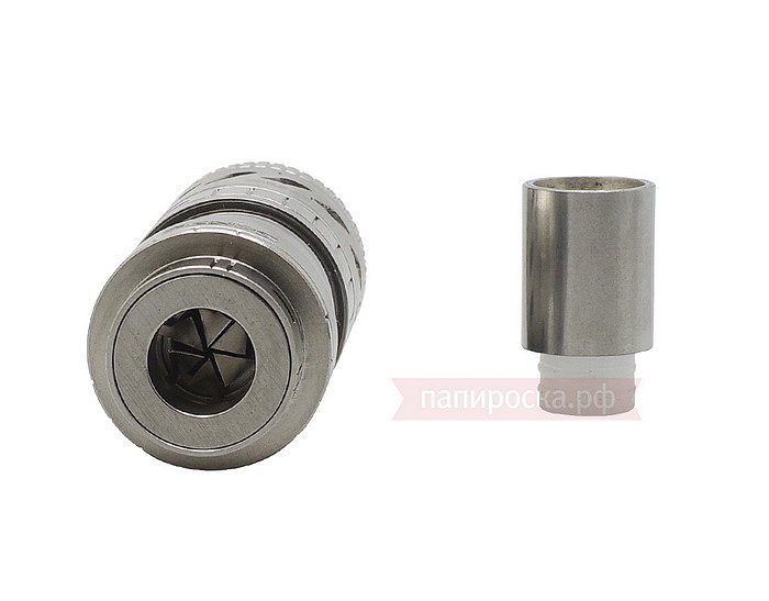 Сверху находится 510 дрип тип. Держится он на двух орингах, внутренняя часть выполнена из делрина, а наружная из нержавеющей стали. Тем самым сохранился внешний вид и остался функционал. Делрин не передает тепло, за счет этого дрип тип атомайзера остается теплым, тем более на больших мощностях.