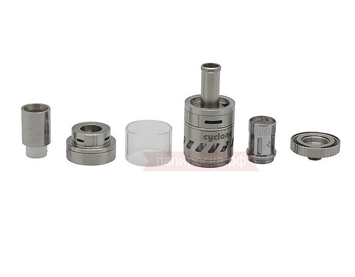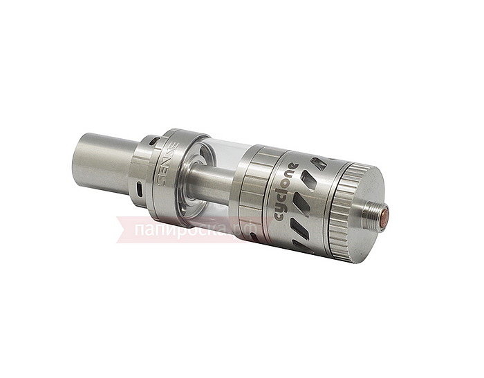 Далее идет «тело». Тело танка монолитно с шахтой. Данная конструкция позволила увеличить объем вмещаемой жидкости до 5 мл, а также сделать более удобным разбор и промывку. На корпусе тела есть гравировка с названием «cyclone». Имеет кольцо регулировки обдува. Воздух забирается через сетку испарителя, которая несет за собой функцию защиты от брызгающей жидкости. Ниже регулировочного кольца есть окна для отслеживания количества жидкости. На основании есть два регулируемых окна подачи жидкости. При заправке танка следует перекрывать окна. Проконтролировать открыта или закрыта подача можно при помощи гравировки на корпусе. Если риска стоит рядом с капелькой, то подача закрыта. Если с изображением лица - открыта.
