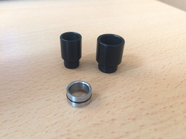 Сверху устанавливается дрип тип, в данном случае в комплекте идёт широкий дрип тип, переходник под 510 дрип-тип, а также дрип-тип более меньшего размера. Ничего выдающегося об этих дрип типах сказать нельзя, выполнены из Delrin'а, однако рекомендую подобрать другой дрип-тип для парения.